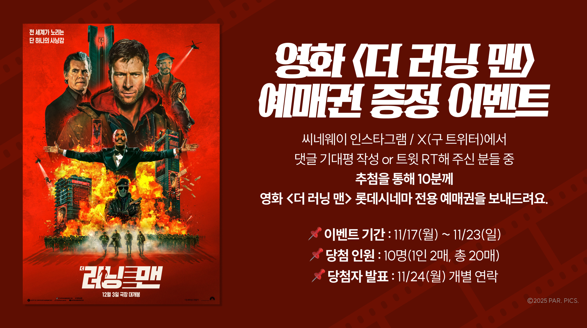 차가운 겨울의 추위를 짜릿한 도파민과 함께 녹여버리고 싶으신 분, 화끈한 액션으로 일상의 스트레스를 해소하고 싶으신 분, 에드가 라이트 감독이 그리는 새로운 세계가 궁금하신 분이라면 오는 12월 3일, <더 러닝 맨>을 극장에서 확인해 보시는 건 어떨까요? 오늘 9시부터 씨네웨이 인스타그램과 X에서 예매권 이벤트가 시작해요! 댓글로 <더 러닝 맨>을 향한 기대평을 남겨주시거나 트윗을 RT해 주시면 추첨을 통해 10분께 <더 러닝 맨> 롯데시네마 전용 예매권을 보내드릴게요🎟️